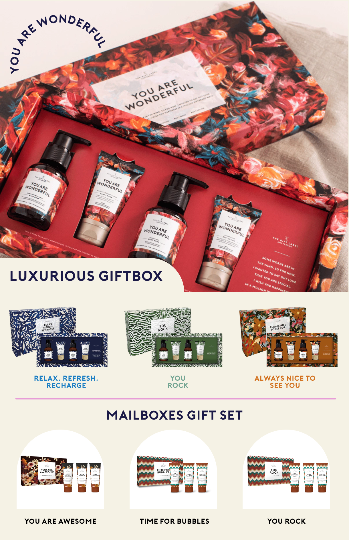 At The Gift Label we create sustainable and lovely gift sets with body care and lifestyle products. The upbeat quotes and beautiful designs create an uplifting experience for both the giver and recipient. We produce our products in The Netherlands and all our products are vegan. The bottles are made from 100% recycled plastic and all products are free of sulfates, parabens, PEG and dyes. We would love to present to you the delicious products. Keep on giving!